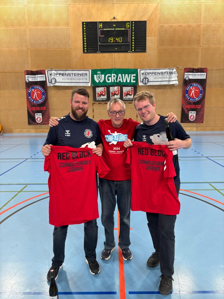 Vor den Fünfhaus-Anhängern auf der Tribüne in der Sporthalle Tellgasse überreichte Turniergründer Ernst Stangl als Dank für die freiwillige Hilfe als Geschenke als Dank und Würdigung. Neben roten Shirts, die die beiden nun als „Schmelzturnier-Legenden“ überall ausweisen, gab es auch Wein. Giefing und Burmann waren nicht nur praktisch das ganze Jahr über im OK-Team aktiv, sondern haben auch Urlaubstage geopfert haben. Beide wurden außerdem stellvertretend für all jene gewürdigt, die teils seit Jahren, manche aber auch erst bei den jüngsten Schmelz-Turnieren als Helferinnen und Helfer zum Erfolg des Jugendhandballturniers des WAT Fünfhaus beigetragen haben. Jährlich sind jeweils gut 80 Ehrenamtliche im Einsatz, noch intensiver ist es für das OK-Team, das sich regelmäßig alle paar Wochen trifft.